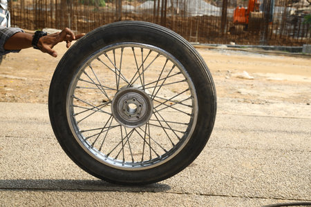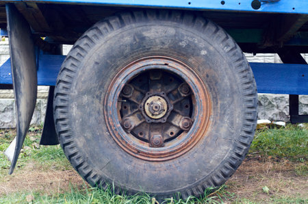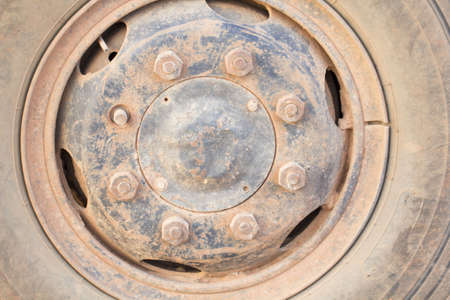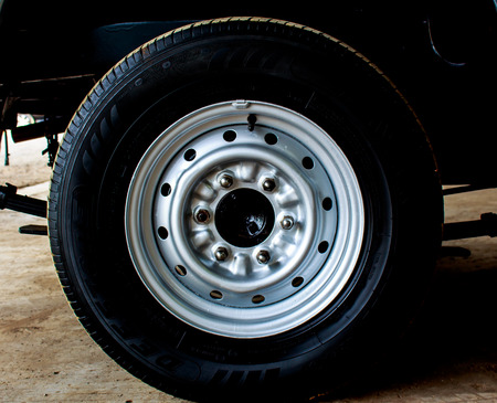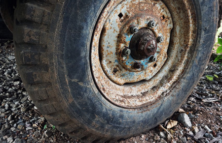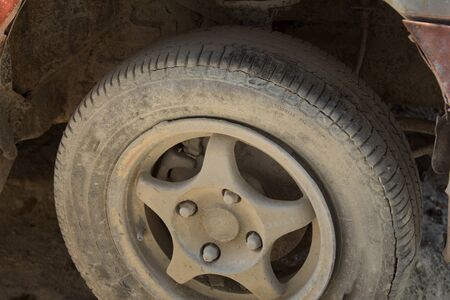 Dirty car tire that has been used for a long time. It is almost out of order and need to be maintenance properly.