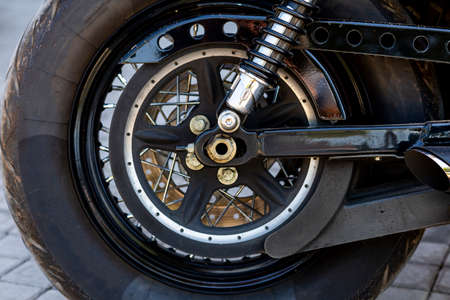 Seville Spain July 12, 2021 Closeup of the mechanics of a motorcycle parked in a parking lot located in the city center of Seville, an emblematic city and the capital of the region of Andalusia, in the south of Spain
