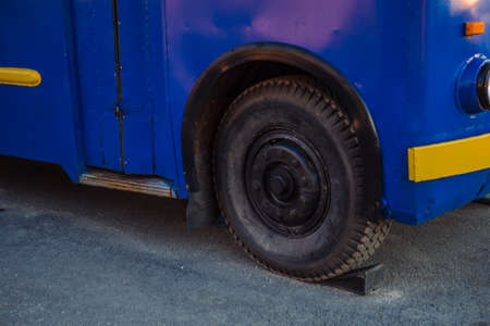 Old blue bus with yellow elements. Museum exhibit at the exhibition of technology. Summer Day