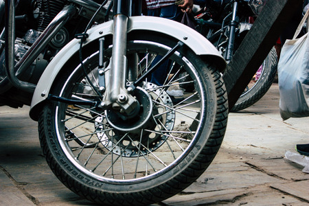 Nepal Pokhara September 12, 2018 Closeup of a Royal Enfield motorcycle parked in the street of Pokhara in the afternoon