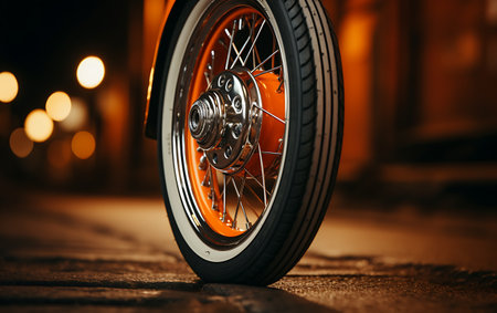 A close-up view of a large industrial tire set against a vibrant orange wall, showcasing the texture and details essential for construction and machinery themes.