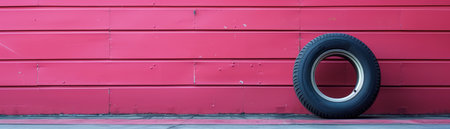 Old Tire Leaning Against a Bright Red Wooden Wall in an Urban Setting, Emphasizing Minimalist Design and Contrasting Colors in Industrial Street Photography, Perfect for Modern Art and Design Inspiration AI Generative