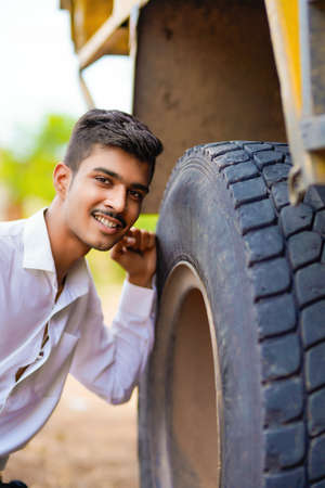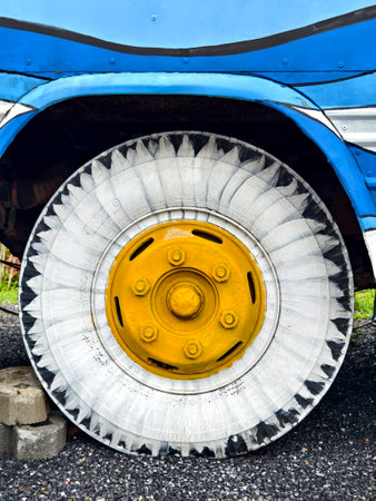 Close-up photo of a car wheel of E-taen Thai tractor. Space for text.