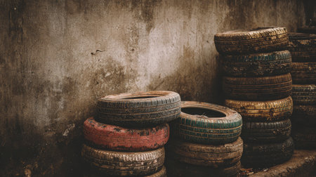 This image captures a stack of old, worn tires leaning against a grungy wall, evoking themes of urban decay and neglect in an industrial setting.