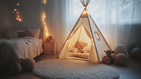 Kids Room, Play house, kids furniture with toy and frame mockup