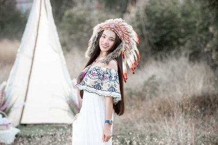 Portrait of a beautiful girl. Indian woman in traditional dress in tent, looking a side, sitting on green grass in summer time.