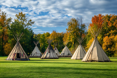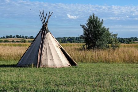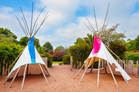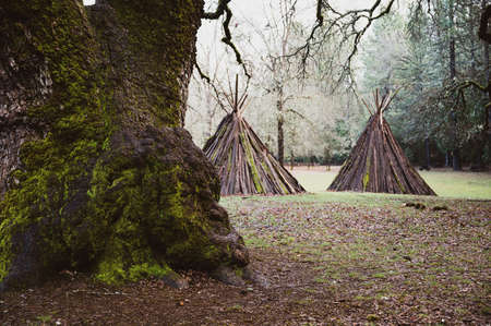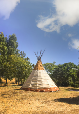 American Indian tepee or wigwam made of sticks and canvas pitched in a field surrounded by leafy green trees