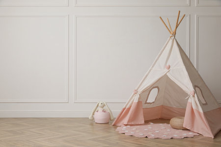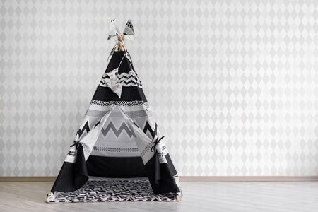 Teepee hut in forest on autumn day. Dream house for a family with little kids.