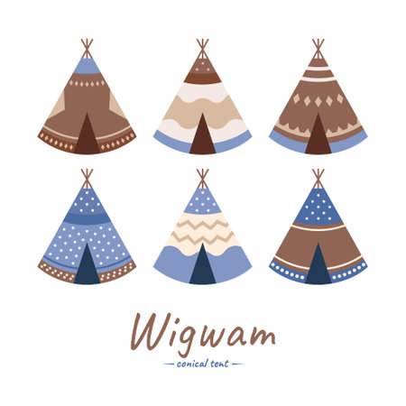 Traditional Native American tribal mobile house wigwam set isolated on white background.