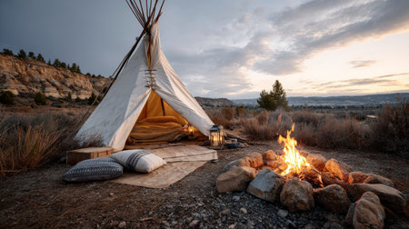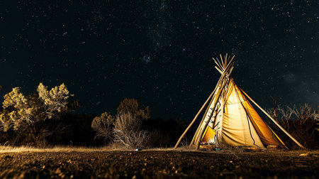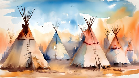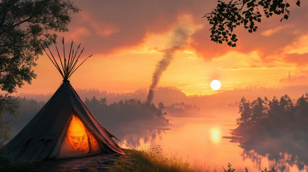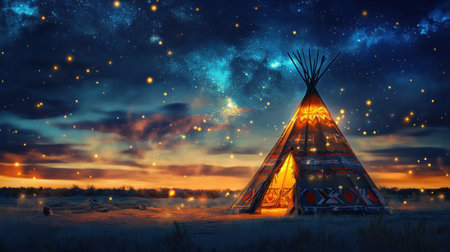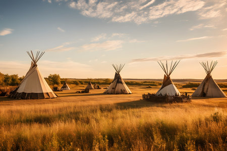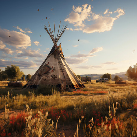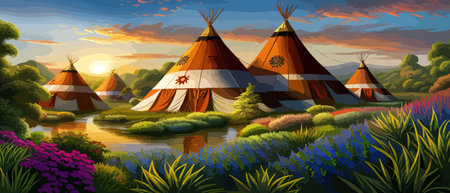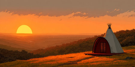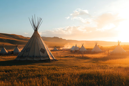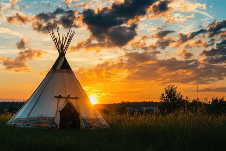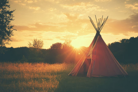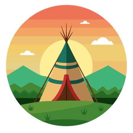 Tribal Indian teepee in the field at sunset. First Nations tips on the open prairies of North America. . AI generated. Vector icon