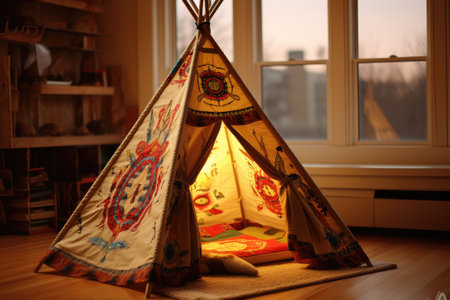 Multi-colored wigwam with various ornaments and patterns stands in a room in the house vector cartoon