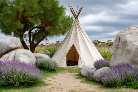 Amidst a lush field a summer wedding tipi offers a charming view. The traditional wigwam adorned with dreamcatcher decorations symbolizes joy and celebration in a natural garden setting.