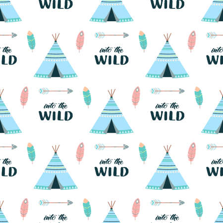 seamless pattern with cartoon tribal teepee, pastel colors on white background, wigwam wallpaper, cute boho background with tent, arrows, feathers and text