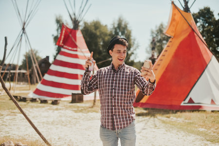 Back view of a young man tourist taking photo of teepee / tipi- native indian house with smartphone. Taking photo of wildlife. Man in hat traveler.
