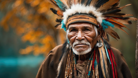 An Indigenous elder stands proudly, adorned in traditional attire showcasing intricate beadwork and a striking feathered headdress. The soft lighting highlights the elder's wise features and cultural significance, emphasizing the vibrant colors of the traditional garments.