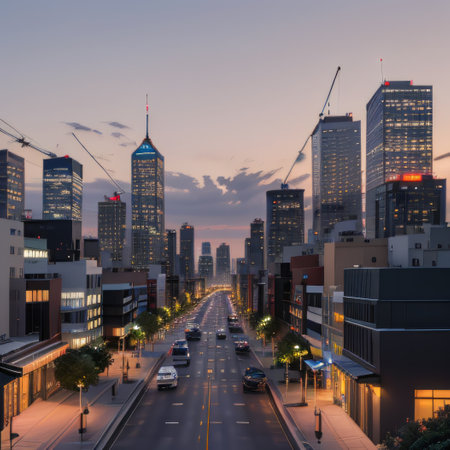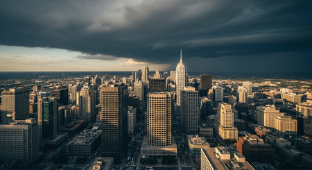 Stunning aerial perspective of a metropolitan city with modern buildings, lush green parks, and busy streets, perfect for showcasing urban life and design.