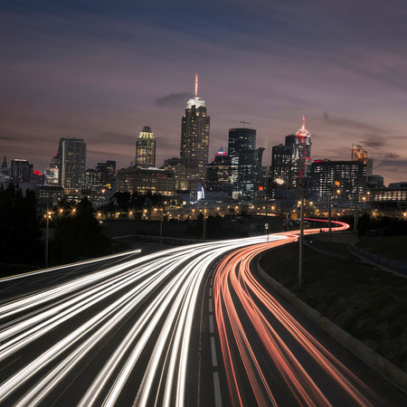 A cityscape at dusk with a busy highway and skyscrapers in the background