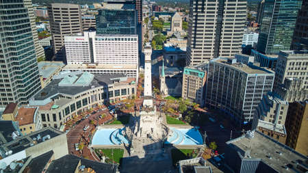 Iconic Soldiers and Sailors Monument from above and showcasing city in downtown Indianapolis, Indiana