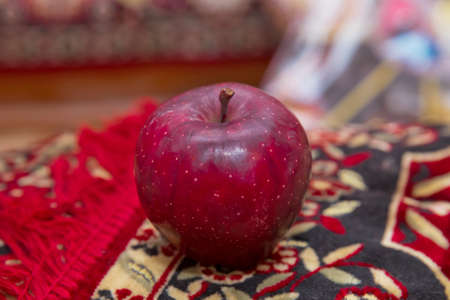 Large red apple in the carpet . Full depth of field. Autumn harvest concept - Fresh ripe organic red apple , dark stone background. Vegetarian, vegan, healthy diet food. Selective focus.