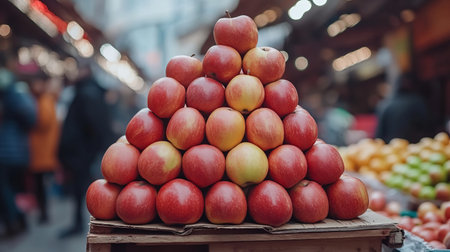 A vibrant display of bright red apples meticulously stacked in a pyramid shape, showcasing their fresh and appealing nature in a market setting.