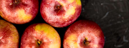Banner of Fresh organic red apples on black background. Flat lay. Frame. Top view. Copy space. Autumn harvest