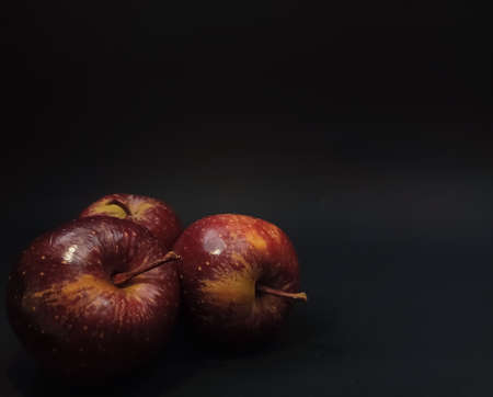 Three fresh raw ripe red apples on black background. Selective focus.