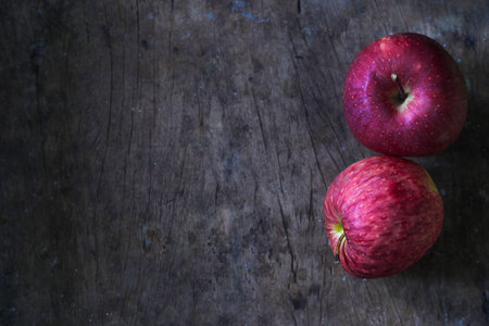 A top view of red ripe apples isolated on a wooden surface; background with copy space on the left
