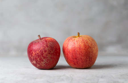Rotten apple on concrete wall.Soft focus.
