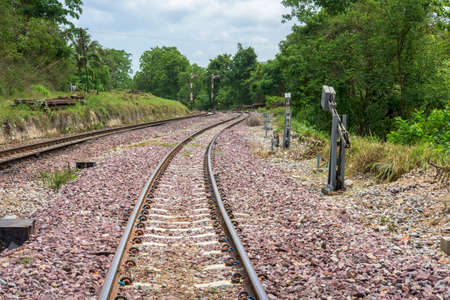 Railway tracks from one city to another in Thailand in the evening of the sunset.