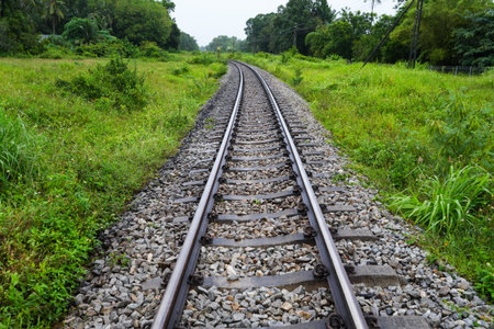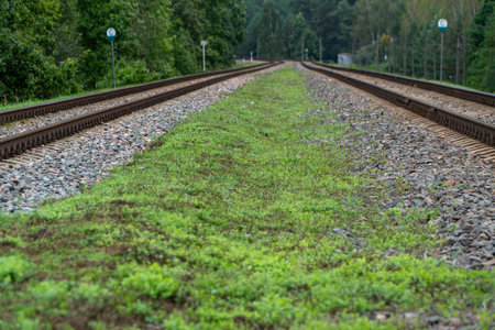 Railway track on crushed stone base, infrastructure in countryside