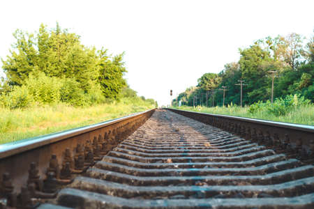 Empty straight single-way railways at summer sunny day.