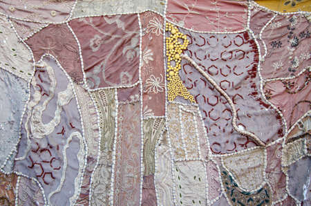 Silk sepia color with floral print and rhombuses. Soft fabric, glossy texture background, satin background, fabric luxury work, elegant pattern, colorful abstract, colorful velvet, macro shredded.