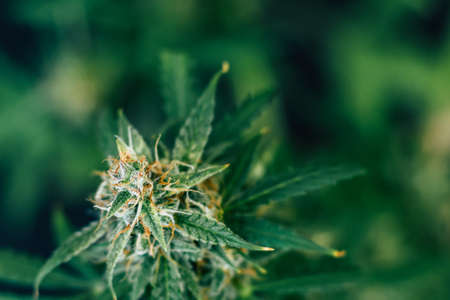Flower bud of cannabis Satival in the greenhouse, marijuana flower bud background, herbal medicine. Concept of herbal alternative medicine, cbd hemp oil.