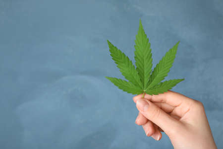 Woman holding hemp leaf on blue background, closeup. Space for text