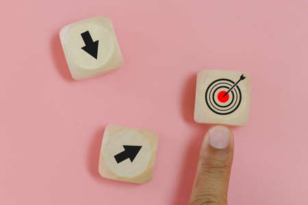 Hand of man finger pointing selection wooden cube blocks with Goal icon. Goal and target concept.
