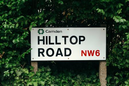 London, UK - July 30, 2018: Hilltop Road street sign, Hampstead, London Borough of Camden, UK