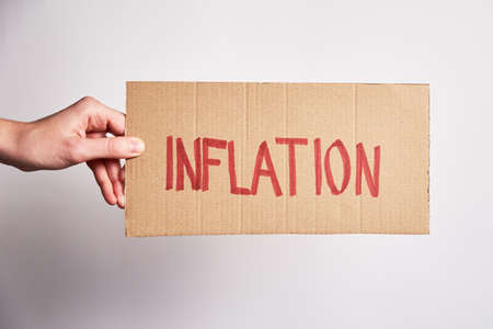 Woman hands lift and show cardboard rising inflation sign