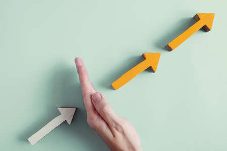 Hand Turing wooden block to increase level from low and high of inflation rate for economic growth and recession of goods increase price concept.