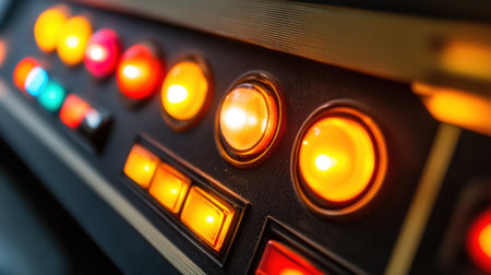 This close-up image showcases a retro control panel with illuminated buttons in vibrant colors. Ideal for representing technology, innovation, and design.