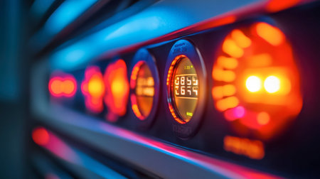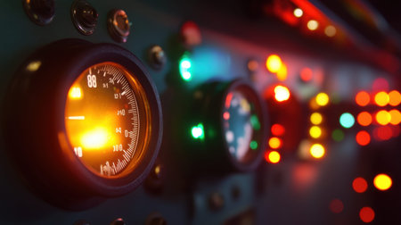 Closeup of a vibrant control panel featuring gauges and illuminated indicators. The colorful lights create an engaging atmosphere, perfect for technical themes.