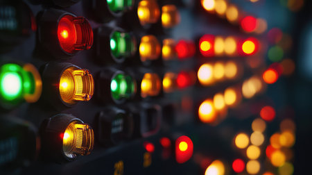 An abstract view of an industrial control panel displaying vibrant LED indicators. The image showcases technology elements, perfect for themes of automation and equipment management.