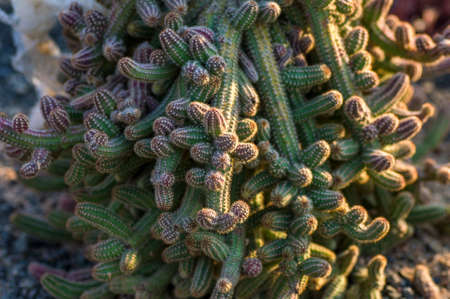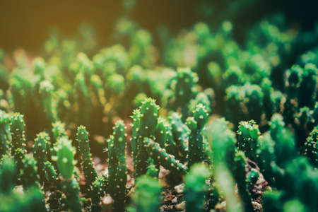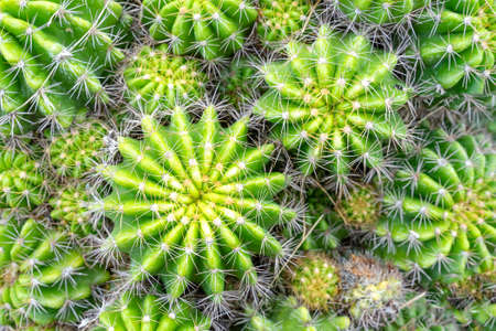Texture green prickly cacti close-up, beautiful background. Densely growing cacti in Sunny weather grow on the African continent. Very sharp spikes that are invisible. Home decor,