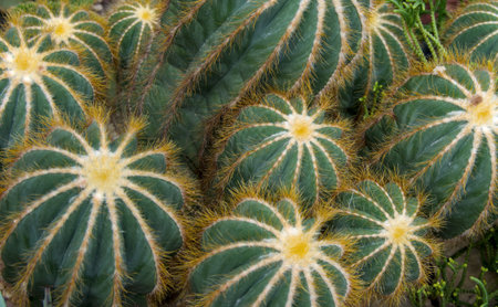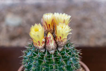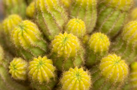 Close-up group of yellow succulent cactus for background. Colorful cactus with round shape and little sharp thorns for room decor. (Gymnocalycium)