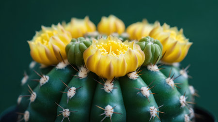 Close-up view of a vibrant cactus with stunning yellow flowers on a dark green background. Perfect for nature lovers and plant enthusiasts.