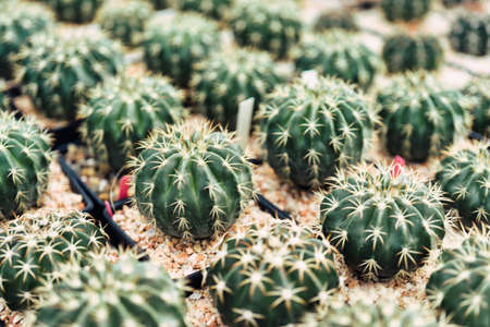 Cacti of different shapes and breeds on the cactus farm. Plants for home and yard decor.