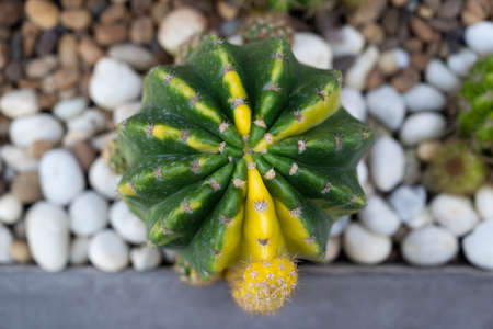Close-up of Variegated cactus (Echinocactus), a succulent plant with green and yellow stem, round-shaped, and decorate with pebbles in the rock garden.