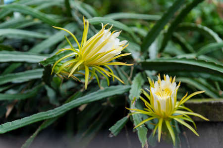 Beautiful white dragon fruit flowers with green nature background.