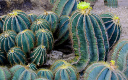 Large group of large cacti Echinocactus grusonii, Golden Barrel Cactus, Golden Ball Cactus