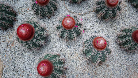 Melon Cactus (or Turk's Cap, Gray Melon Cactus) with red hairs. Its scientific name is Melocactus Caesius (Syn. Melocactus Curvispinus). Prickly cactus spines of a very dangerous succulent plant.