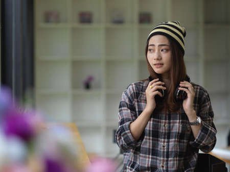 Fashion, music and a gen z woman thinking in studio on a rain wallpaper background for trendy style. Cyberpunk, idea and headphones with an attractive young female person looking cool or edgy